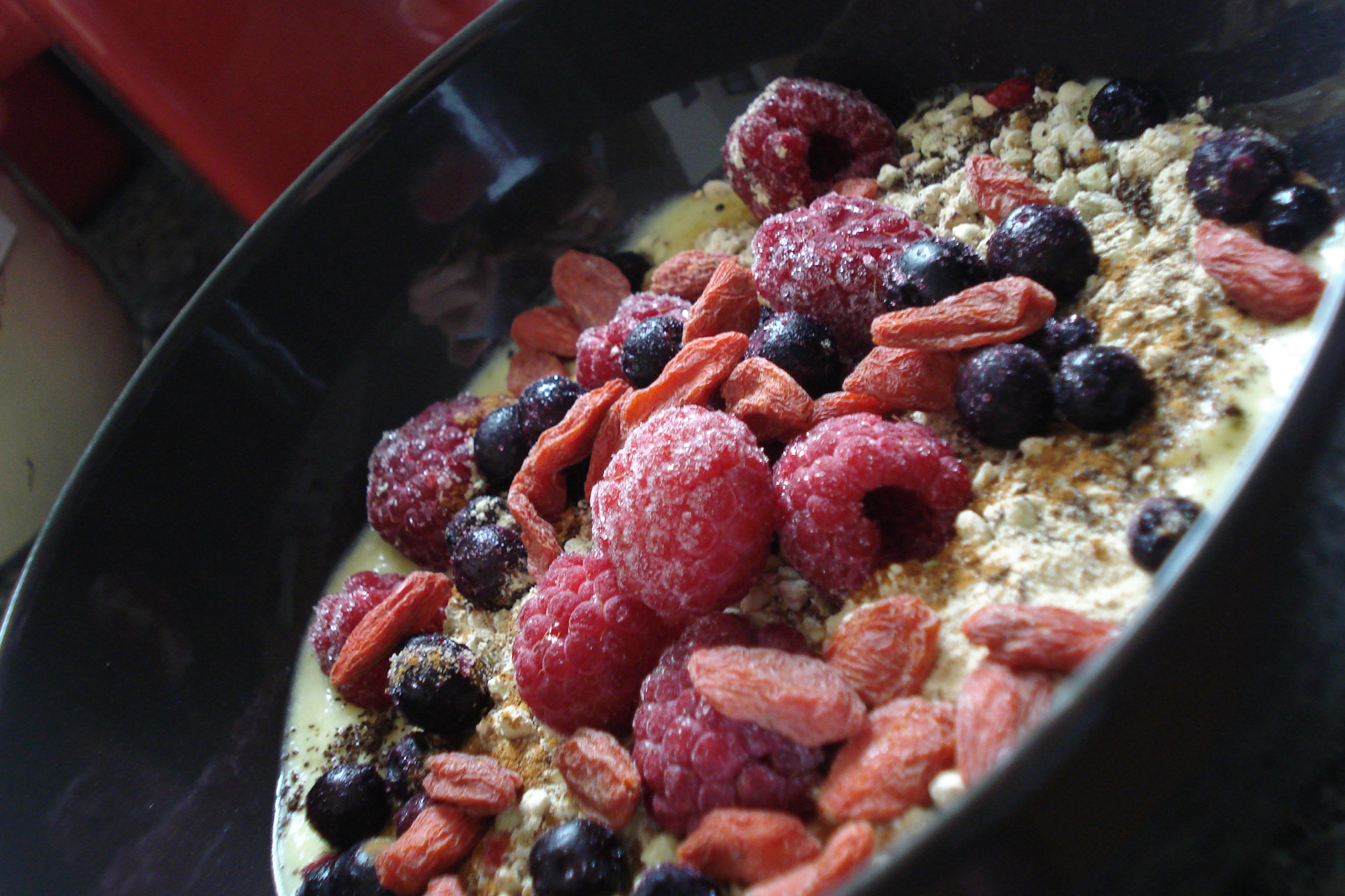 Transfer to bowls and top with fresh or frozen blueberries, raspberries, goji berries, raw granola (I’ll post a recipe for that soon), ground vanilla, maca, mesquite, and I love cinnamon on mine!