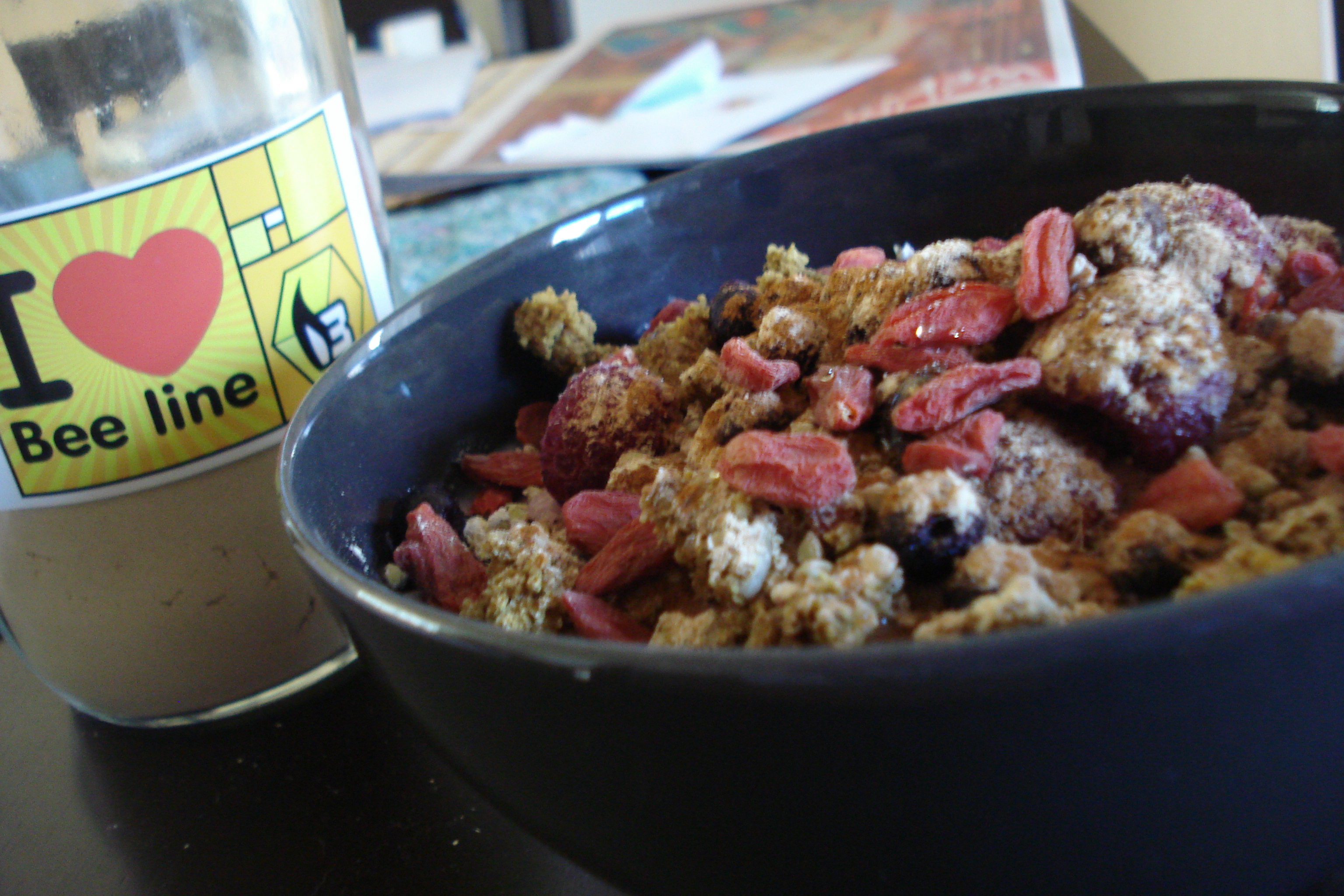 I prefer to use Sambazon’s acai packets in place of the mango, but they’re rather expensive…a wonderful treat though. So that’s one way I start my morning…either a fruit bowl with raw granola or a superfoods smoothie/drink.