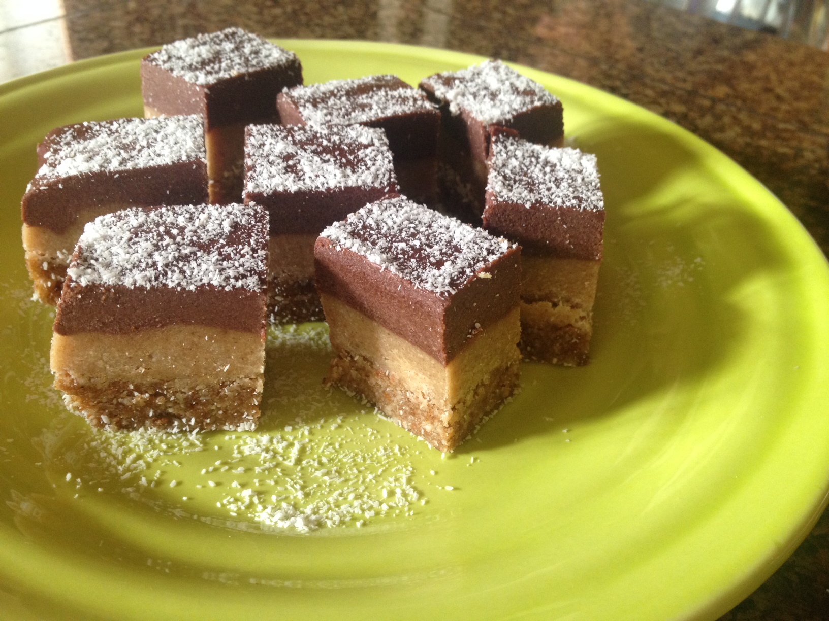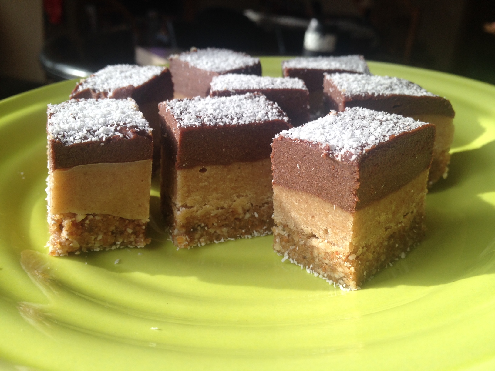 The caramel layer is to die for and I imagine that eating it with fresh fruit would be a great snack. The recipe calls for cashew butter, so I made my own – which is insanely easy if you have a high-speed blender. You literally just keep blending until the nuts break down and turn into a creamy butter…this takes about 3-5 minutes. Next time I make this caramel layer, I want to add in a bit of raw lucuma for added maple/caramel flavor.