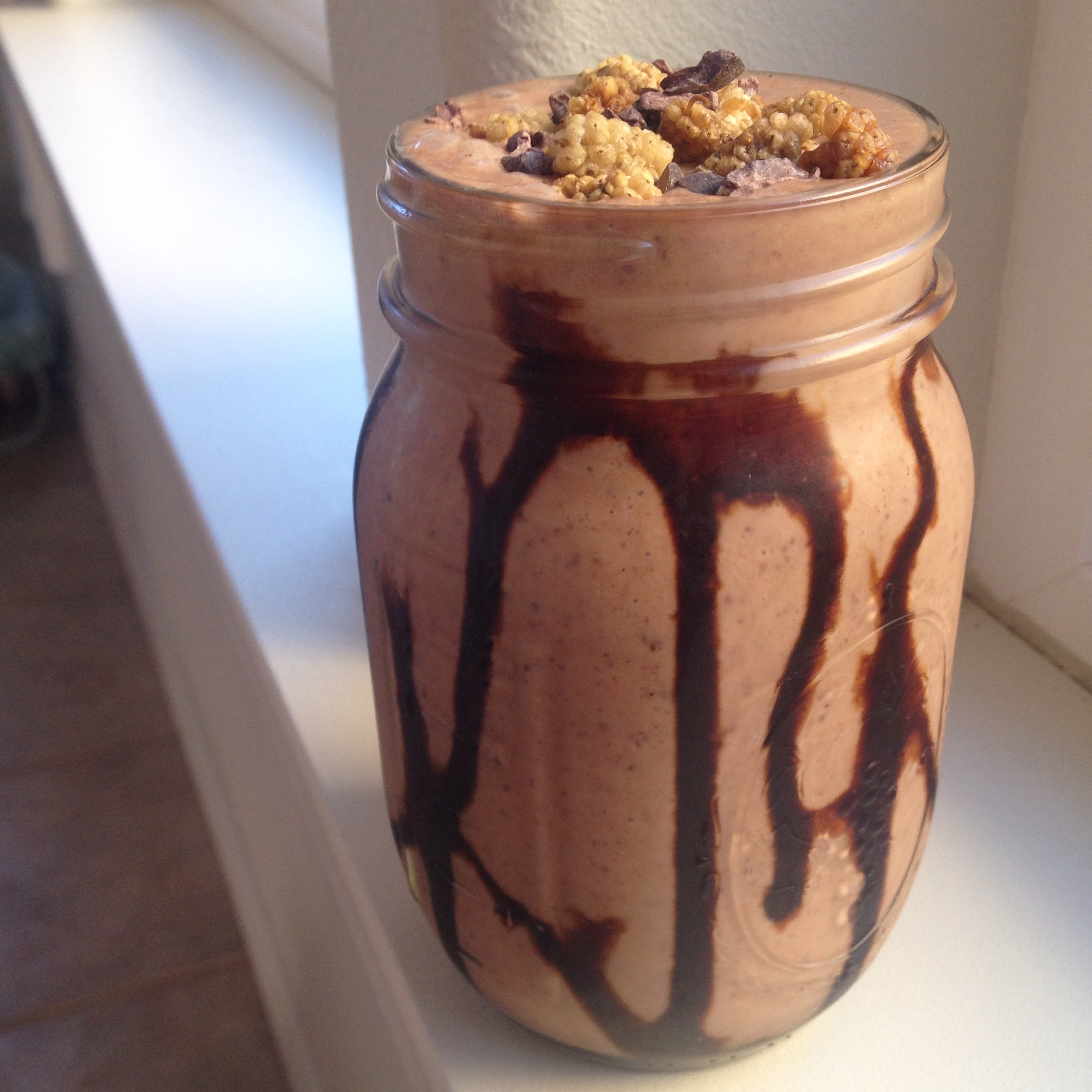 - I drizzled my glass jar with a generous amount of blackstrap molasses, then poured in the thick chocolate smoothie. Toppings are optional, but I love adding them to my smoothies for crunch!