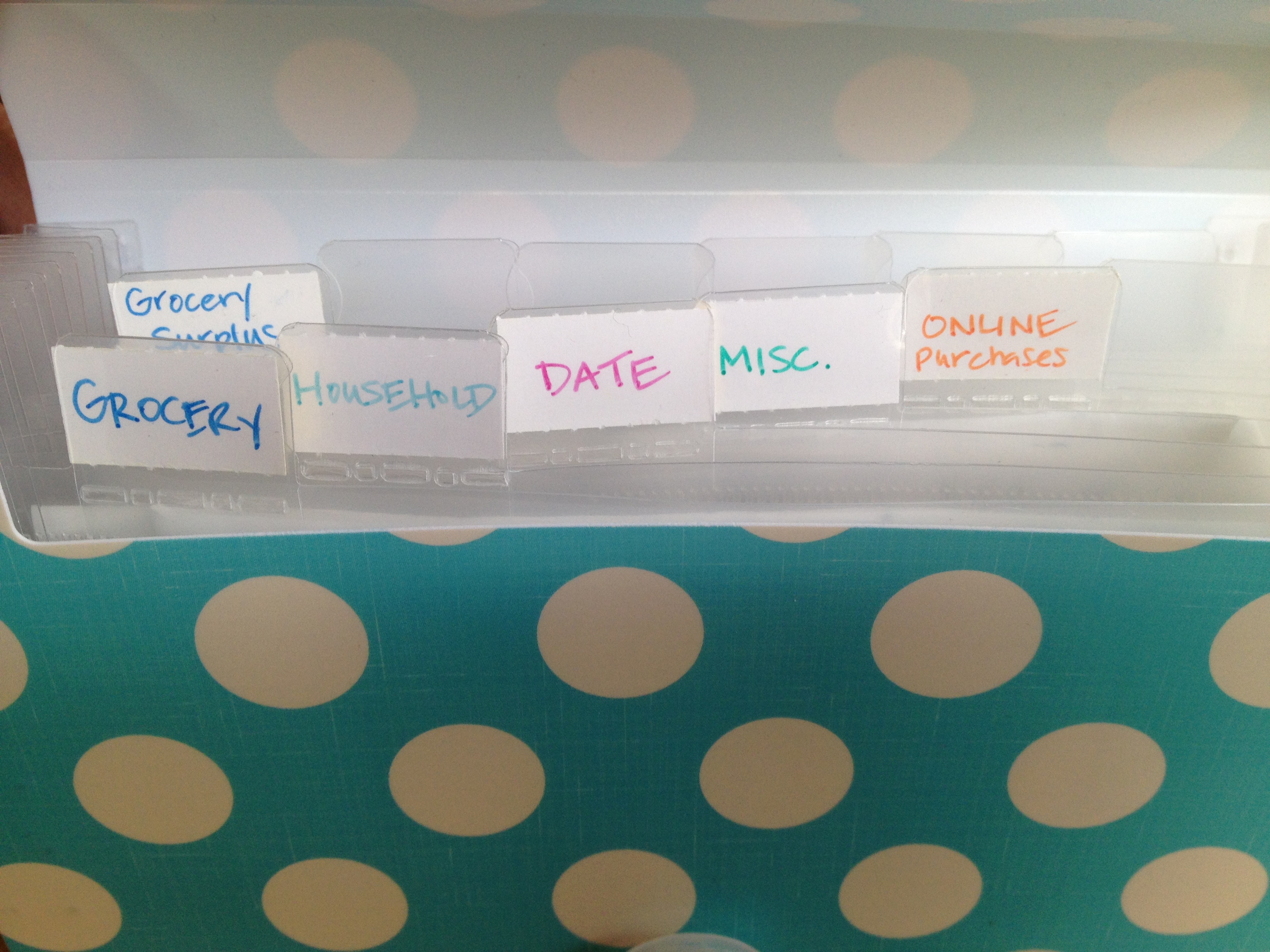 We bought a small expandable file folder with dividers (from Target for $3.99), which we use to keep the money organized and to hold receipts. We have a section for “Online Purchases” – for example, let’s say we order toothpaste for Willow, we would then take money from the “Household” section and move it to “Online Purchases” – the following week, we would take the money that is in the “Online Purchases” file and let’s say there’s $40 dollars in there, we would take out $40 less from the bank for the week and disperse it among “Grocery” or “Household.”