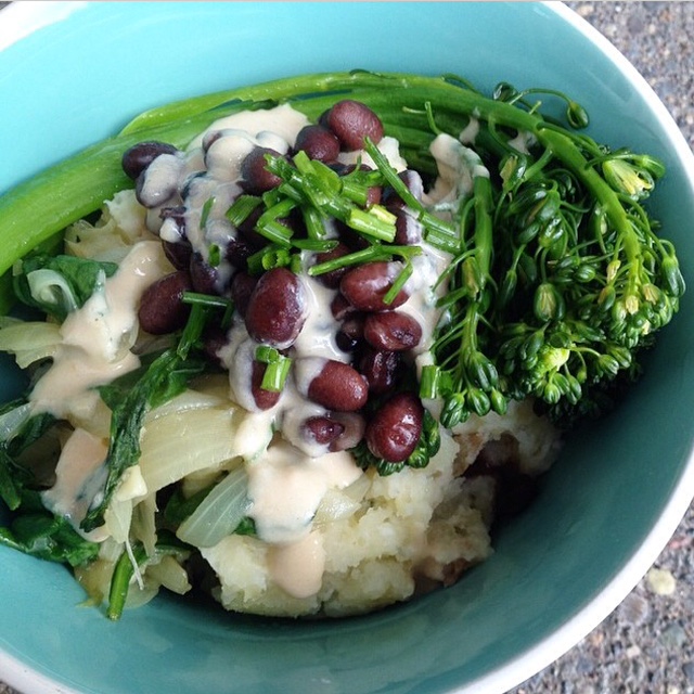 I thinned down the sauce to pour over our mashed potato bowls last week {{Yukon gold mashed potatoes topped with steamed broccoli, black beans, sautéed oil-free onions, fresh chives and the cheezy garlic tahini sauce}}