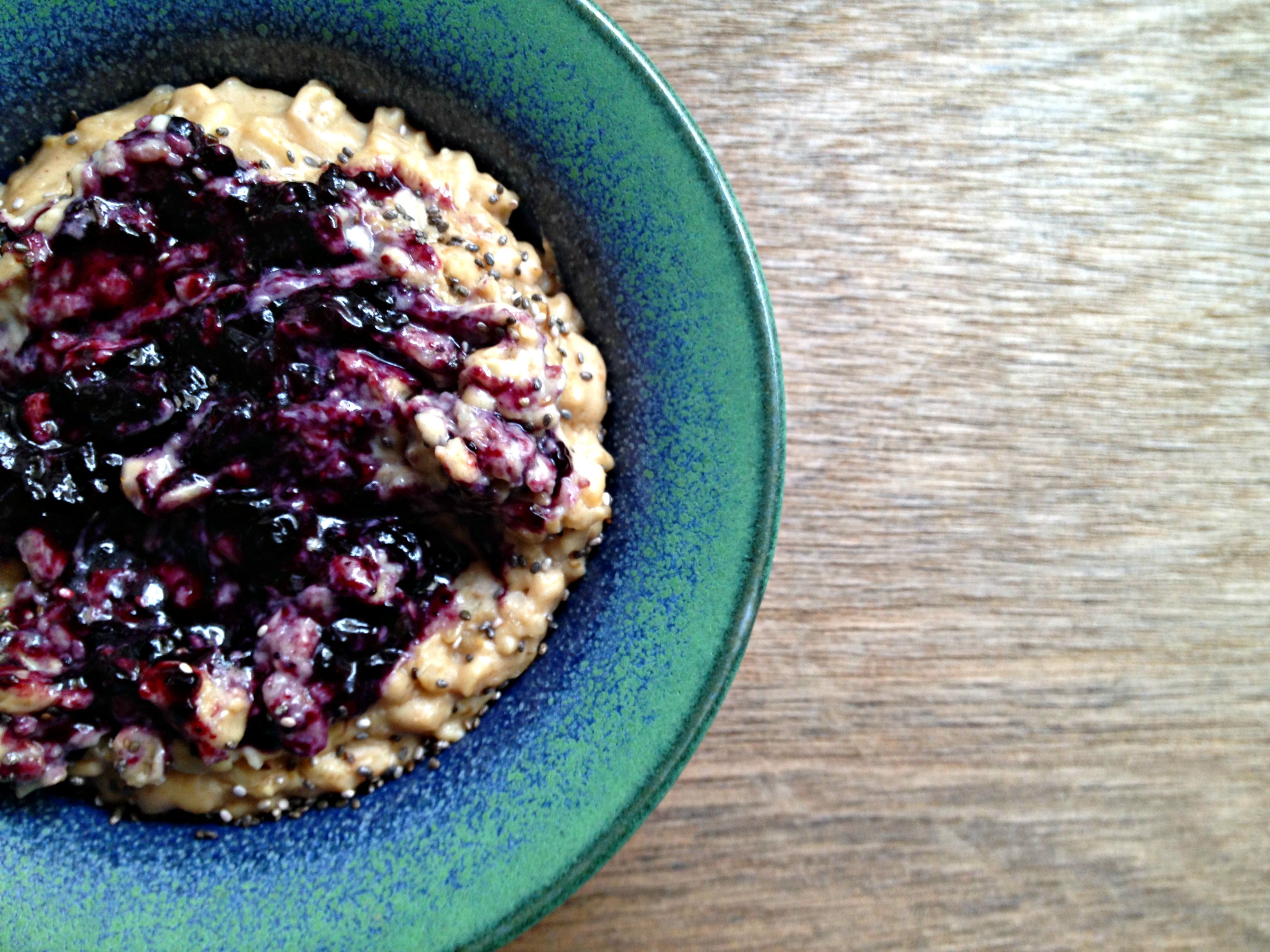 - Transfer to a bowl and stir in the chia seeds and jam. I used organic blueberry jam (apple juice sweetened). Oats fill me up fast, so this recipe makes enough for me to share some with Willow.