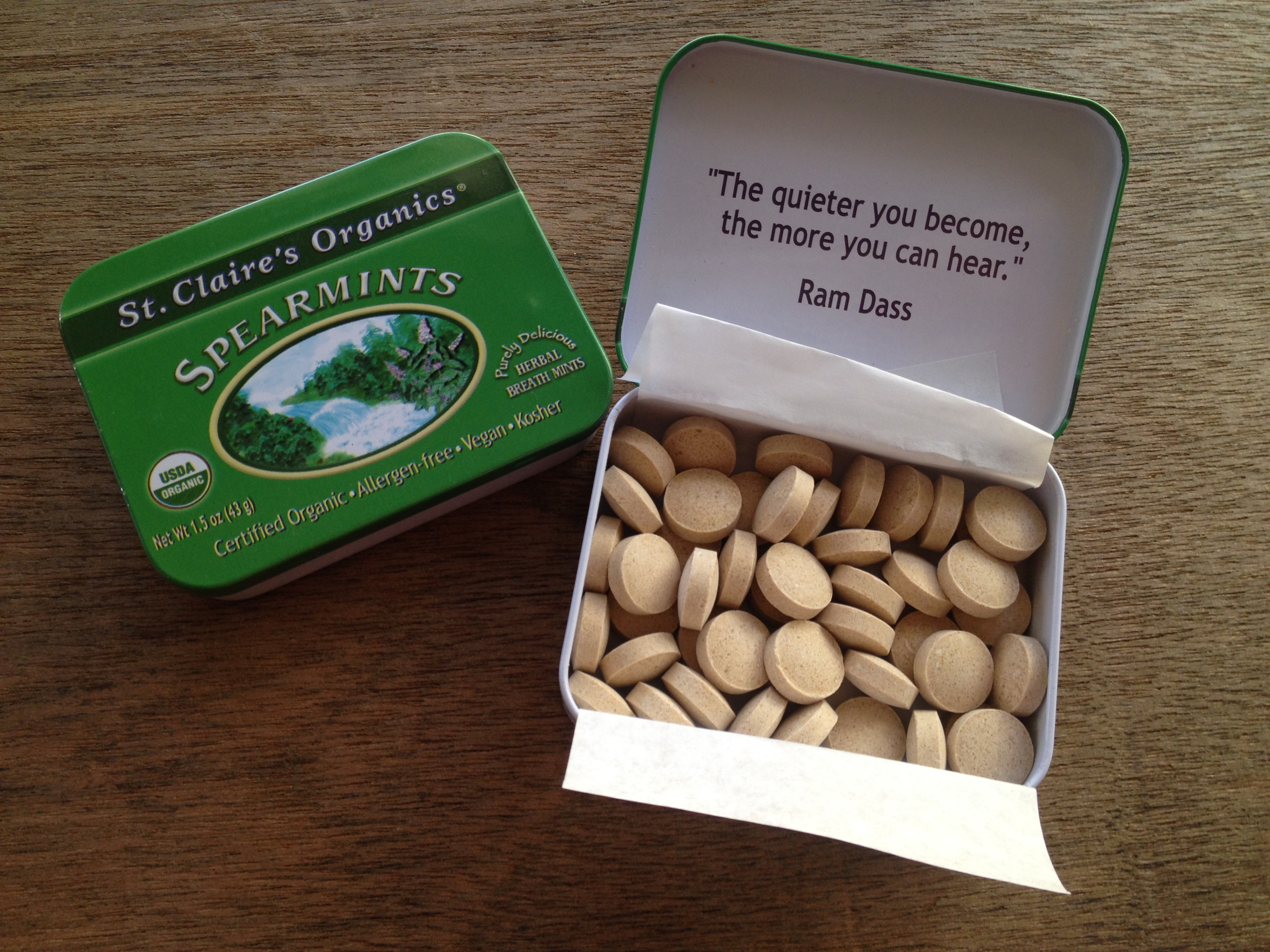 I used to buy mints all the time before I went vegan, that and chewing gum. Then I opened my eyes to the ingredients…and not just the animal derived ones. I stumbled upon these organic mints while standing in the checkout line at Natural Grocers (they always get you at the register). Right there on the tin, it says “Allergen-free and Vegan” YES, PLEASE! I turned the tin over to find only TWO ingredients listed (Organic molasses granules, organic spearmint essential oil). Molasses! So, of course I got them and I’ve been hooked ever since! When Willow sees me pull out the tin, she immediately asks for one, too. They’ve got a great pop of cool spearmint flavor with a rich, sweet undertone….gotta love molasses.