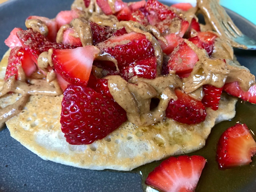 Paleo Vegan Pancakes >> The Real Food Dietitians >> I stumbled upon this one while doing a search for “grain-free vegan pancakes” and ended up pleasantly surprised. If you’re looking for fat, fluffy pancakes, this one isn’t for you. But if you’re looking for a recipe with minimal ingredients that’s easy to whip up, then here you go! We loved the flavor and texture of these, and they reminded me a little of crepes. I loaded mine with fresh strawberries and a generous drizzle of almond butter.
