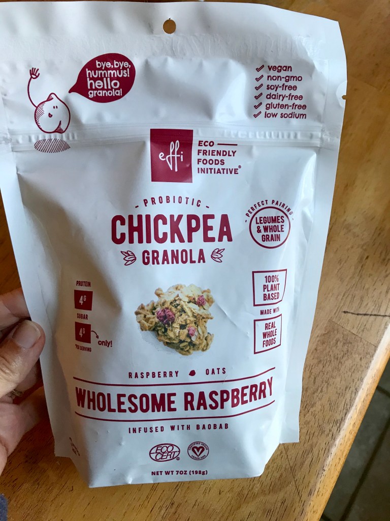 EFFi Foods Probiotic Chickpea Granola >> About a year ago, I stumbled upon this brand while shopping at Whole Foods….It was on sale so I decided to give it a try and LOVED it. Back then, the flavor I had tried was their Gentle Pecan, and it was wonderful. Crunchy, slightly sweet, and satisfying on it’s own (or with milk or yogurt). Josh recently found their Wholesome Raspberry flavor as a “last chance” buy, so he grabbed a bag for us. I didn’t like it as much as the pecan option, but found this was delicious with almond milk. What impressed me most about this little bag is the ingredients – they combine legumes + grains, nuts or seeds, and use coconut sugar + maple syrup as the sweetener. There’s no artificial ingredients, nothing I can’t pronounce, and they use ingredients I would use at home. I promise…there isn’t a strong chickpea flavor, in fact, I found it to go undetected! With our Whole Foods not carrying it anymore, I might look elsewhere, or shop around for online sales.