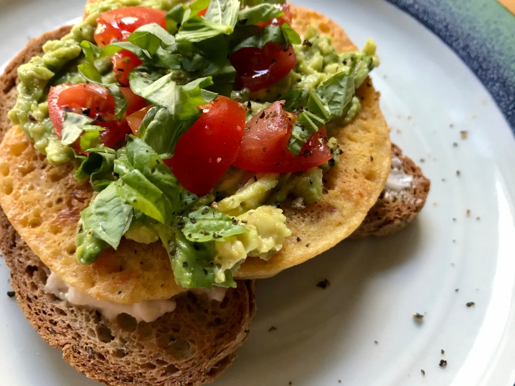Chickpea Omelette Sandwich >> Pick Up Limes >> I have admired Sadia for a few years now – watching her YouTube videos is a form of therapy for me. Her peaceful demeanor, calming voice, and her colorful, nourishing creations are not only a form of art, but also inspiration. So why in the world was this the first recipe I finally tried?!? If this is any indication of how her recipes are, I can pretty much guarantee that you’ll be seeing more reviews in future posts. This was hands down the best chickpea omelette I’ve ever had. The texture was oddly reminiscent of eggs, it was full of flavor, and incredibly satisfying. I loved the addition of a flax “egg” and the chopped red pepper + onion. I added some fresh minced garlic, which I highly recommend. Due to being low on bread, I ate this on a piece of toast with mashed avocado, chopped tomatoes, fresh basil, and a sprinkle of kelp.