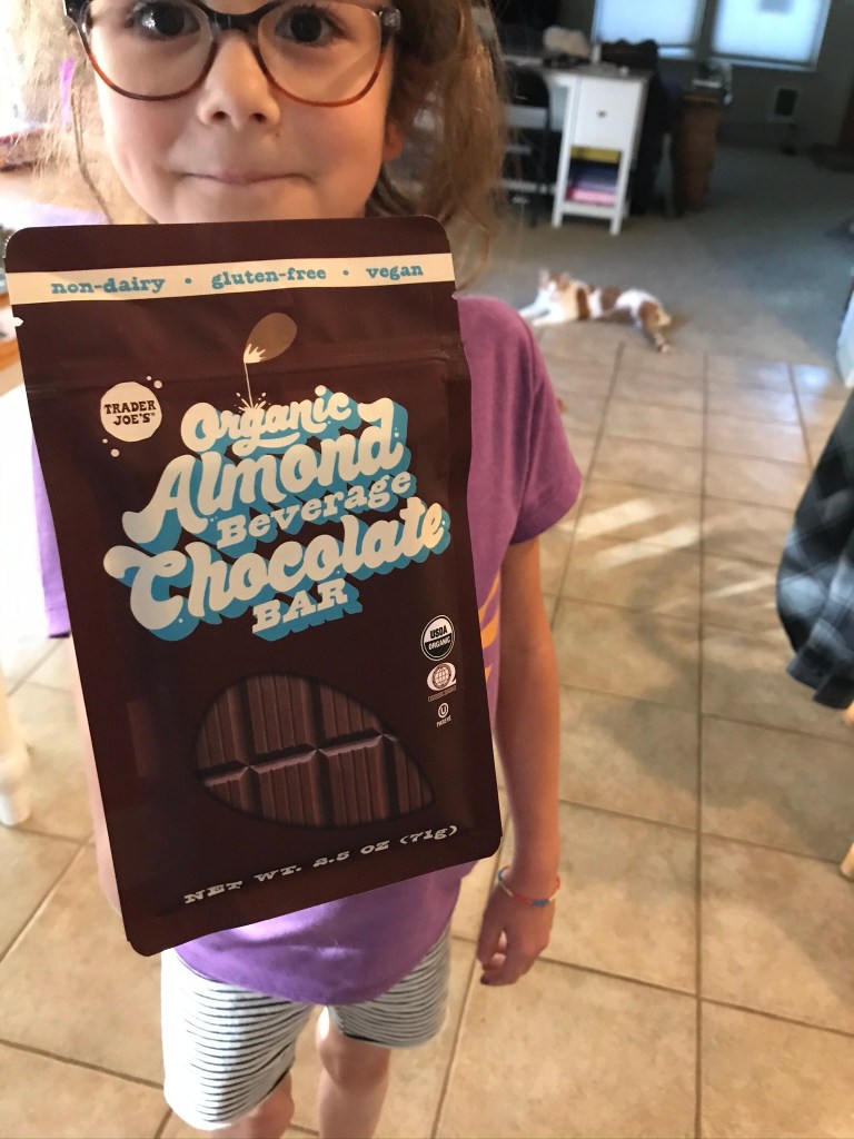 Trader Joe’s Organic Almond Beverage Chocolate Bar >> If you’re looking for a dairy-free, super smooth chocolate bar…here’s a great option. Willow loved it!