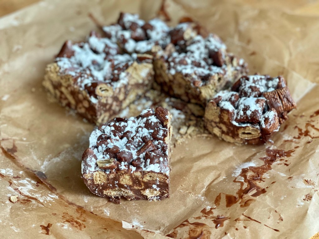I don’t know about you, but Puppy Chow (aka Muddy Buddies) takes me back to being a kid. It was a treat, snack, dessert that I associate with holidays or special occasion. Well, we made these bars as a just-for-the-heck-of-it, midweek treat! I did make a couple of minor adjustments and used what we had on hand: peanut butter instead of chocolate SunButter and Barbara’s Oat Crunch cereal in place of rice chex. We were really impressed with how this cereal worked out – held its form perfectly and added an extra crunch. These were better than how I remember puppy chow being and easier to keep track of consumption! Rather than having a whole container calling my name to eat by the handfuls, these bars provided individual serving sizes…Unless you cut the bars really big! The three of us were covered in chocolate and sad when the last bar disappeared. We will definitely make these again.